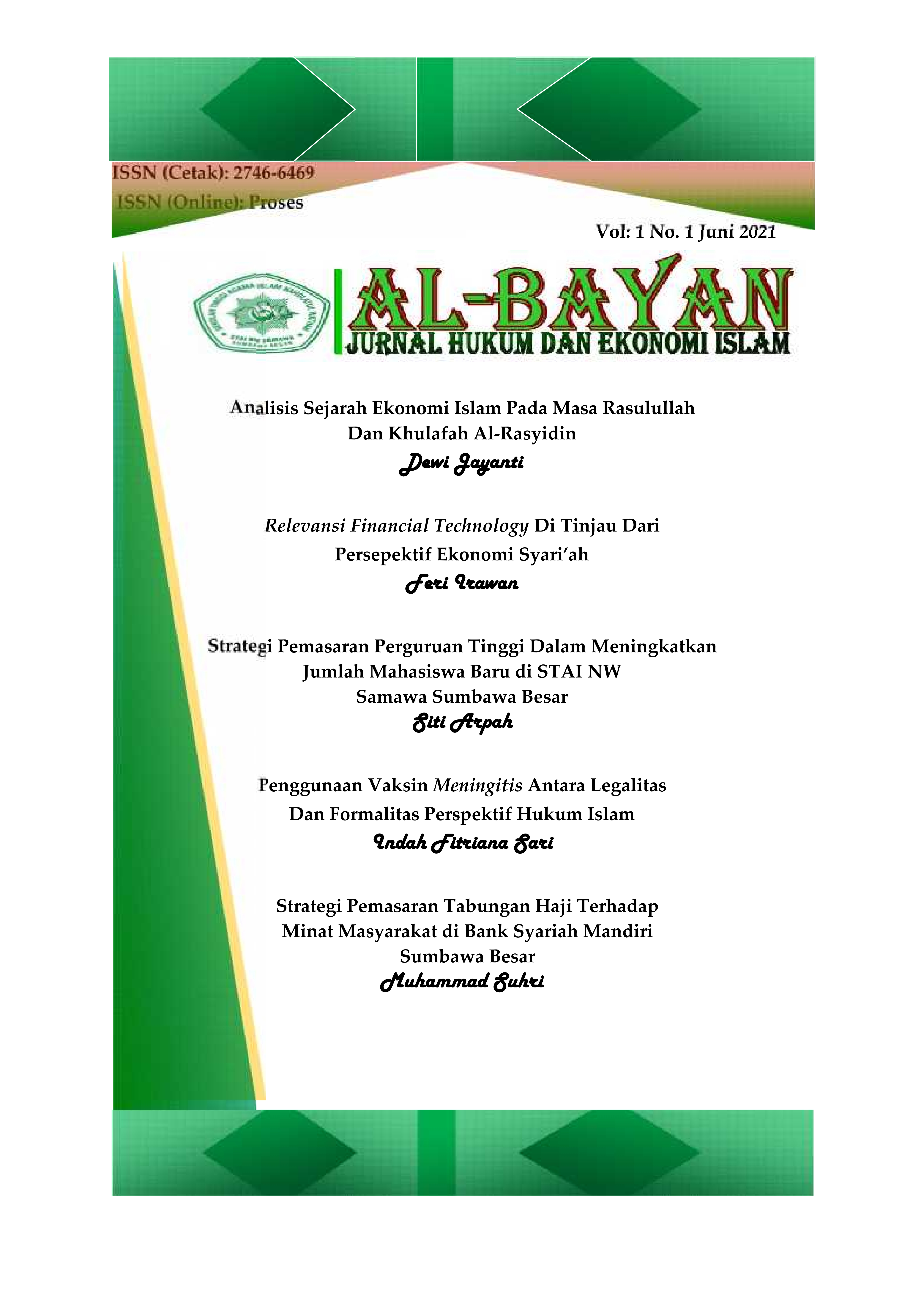 AL-BAYAN menyediakan wadah ilmiah bagi para akademisi, peneliti, dan praktisi untuk mempublikasikan hasil kajian, pemikiran, maupun temuan ilmiah yang relevan dengan perkembangan hukum dan ekonomi Islam baik secara teoritis maupun praktis.